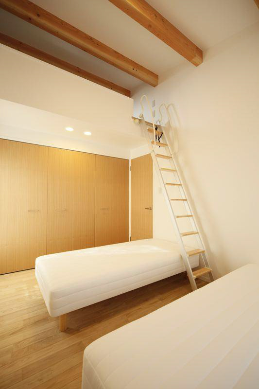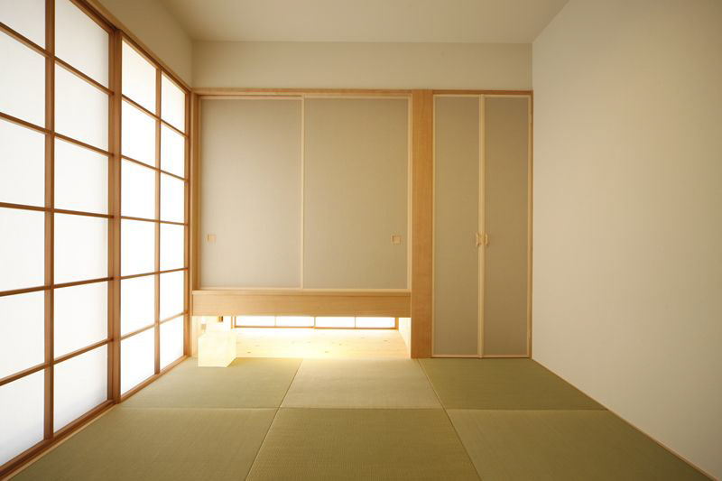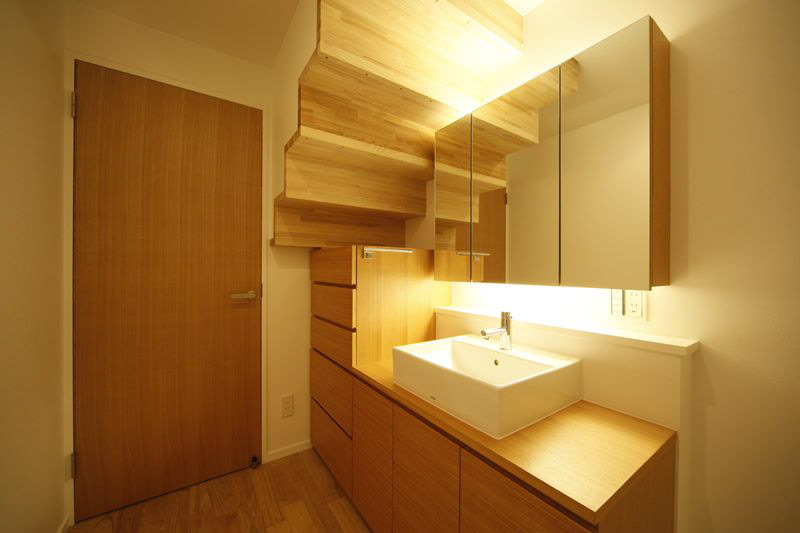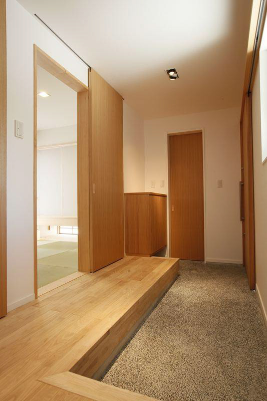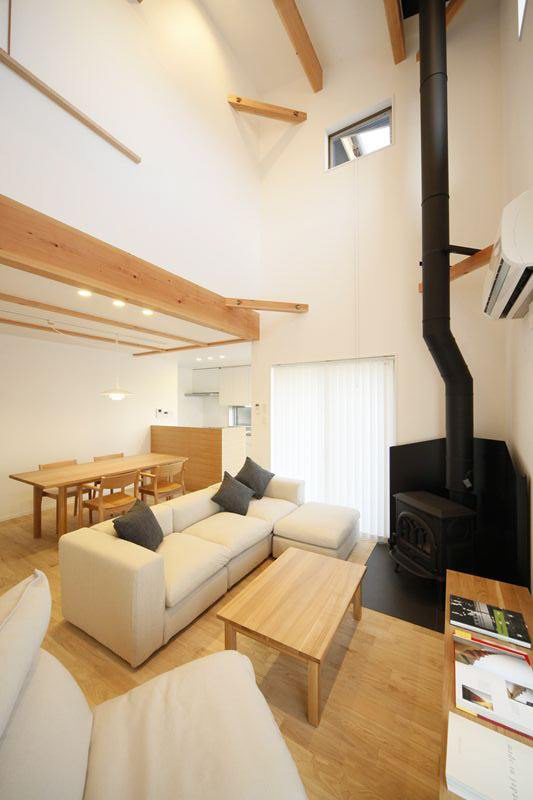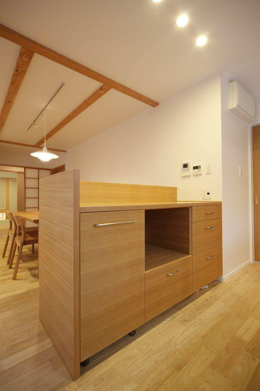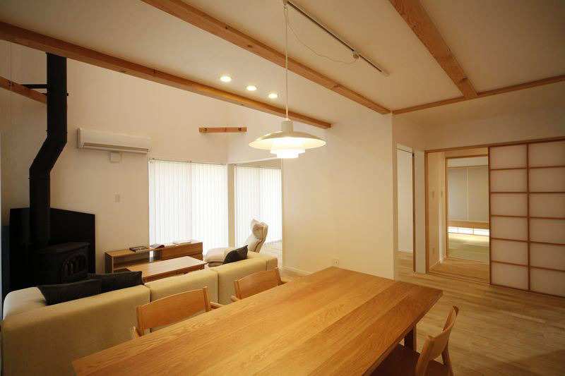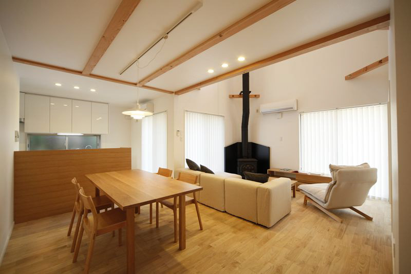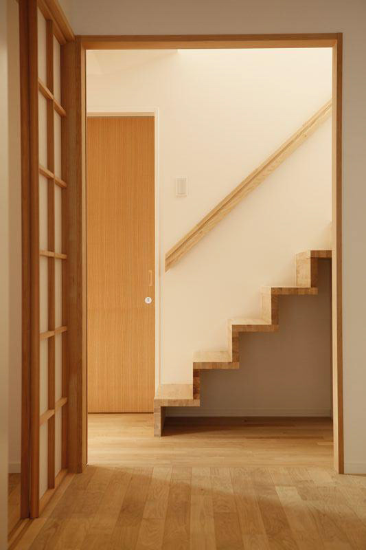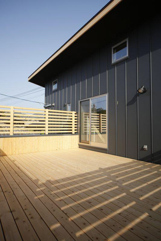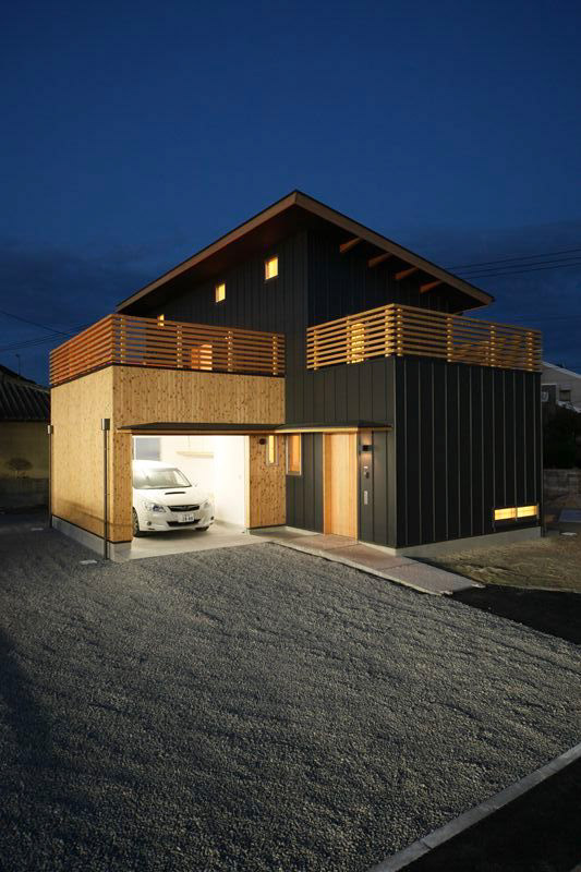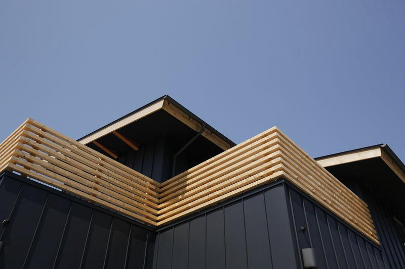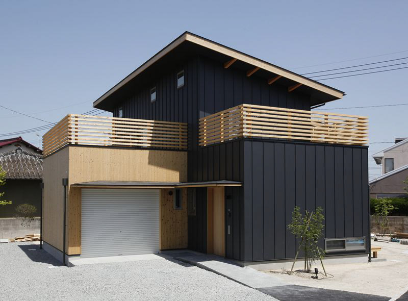 木造2階建、二世代住宅、天然木の羽目板とガルバリウム鋼板の外壁のコントラストが和モダンのテイストを醸し出している。リビングのそばに祖母室を配置しいつも家族の気配を感じられるよう配慮しました。