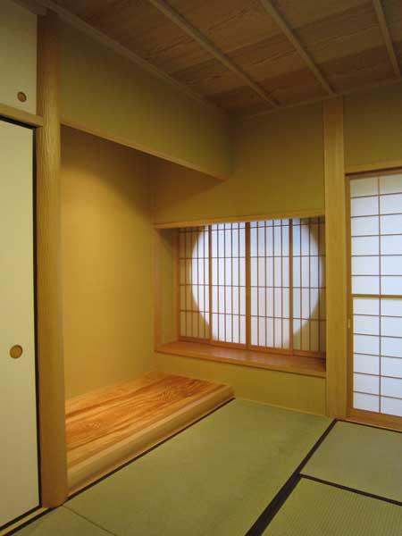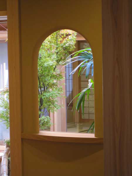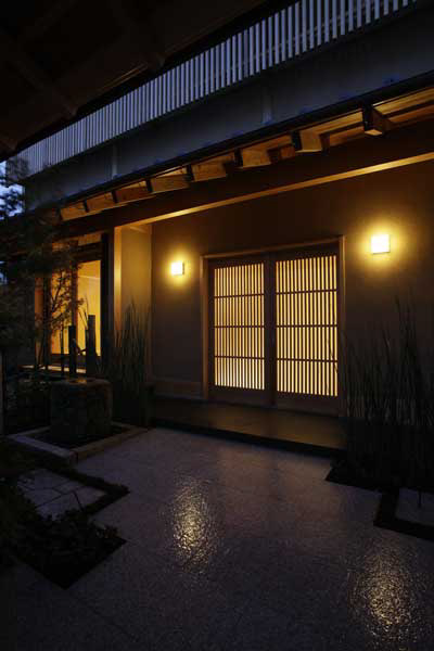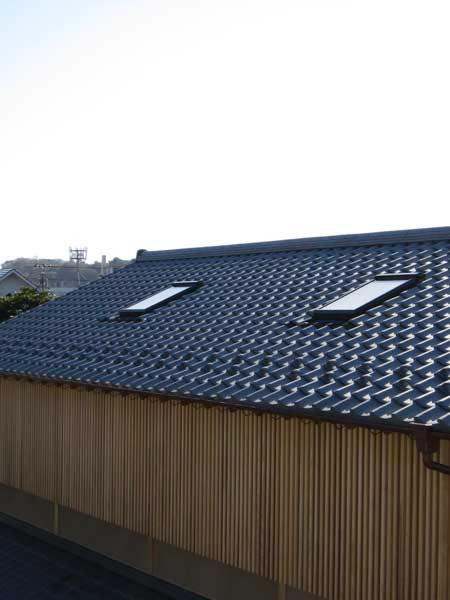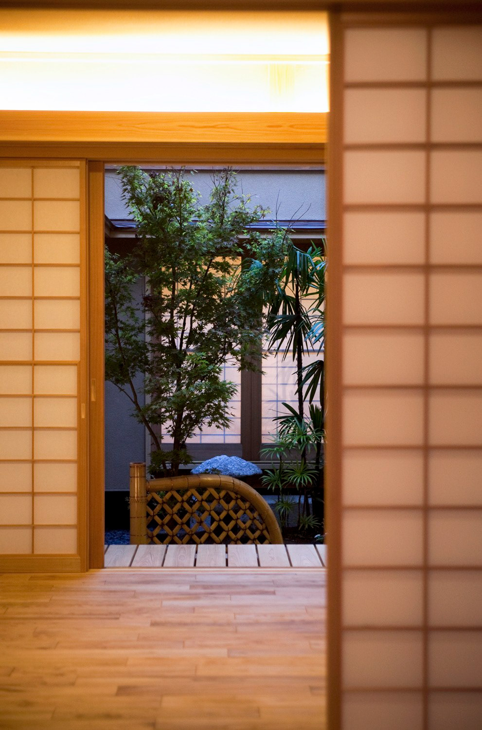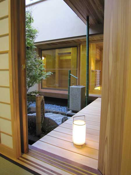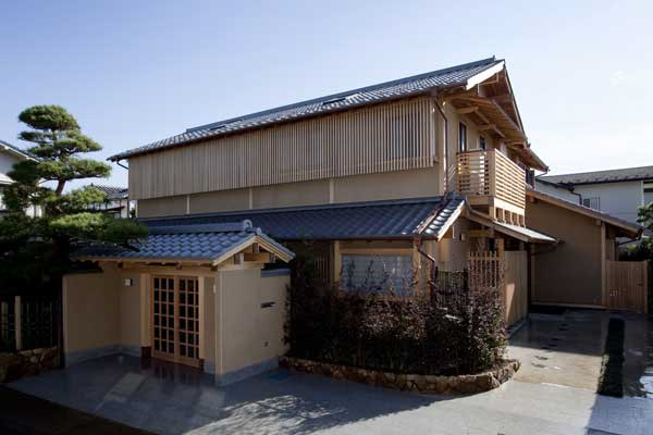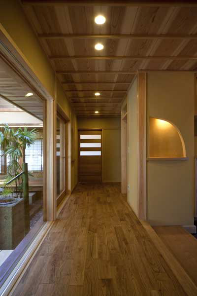 木造2階建、純和風住宅、施主の概念に基づいた、自然素材、いぶし瓦、左官壁、木製建具、天然木をふんだんに使用した、程よい木の香りが漂う癒しの住宅。中庭から各室に採光がまわり、風も抜けやすく配慮、どの部屋からも庭が眺められる。