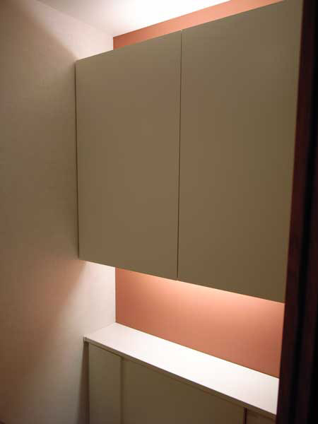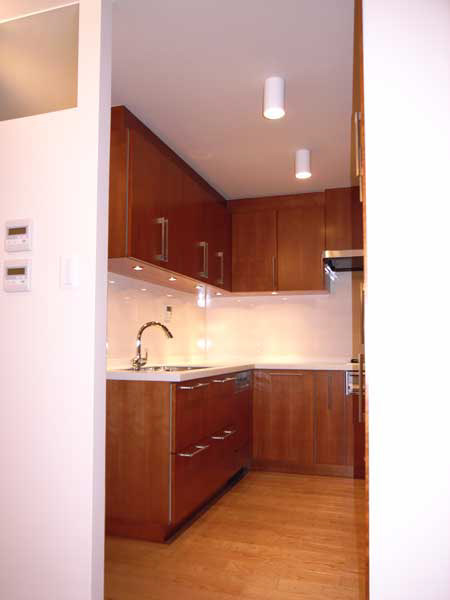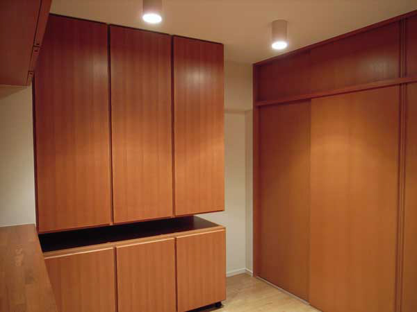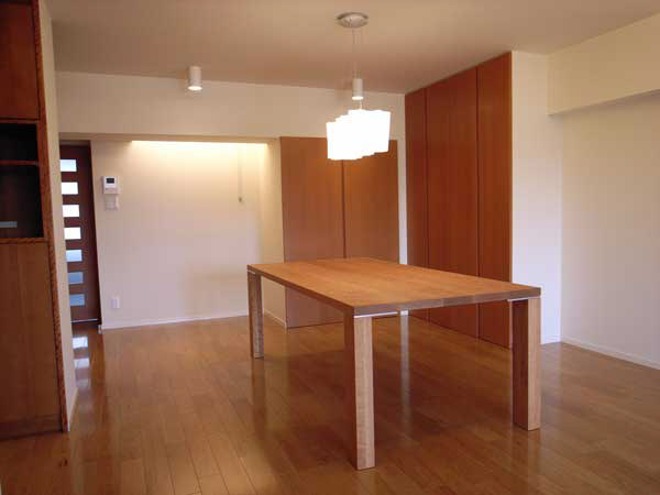 マンション住戸リノベーション、スケルトン後再構築。家具、キッチン、木製建具フルオーダーで造作。床のアメリカンブラックチェリーに合わせながら色を統一して全体的に落ち着きを持たせている。