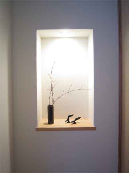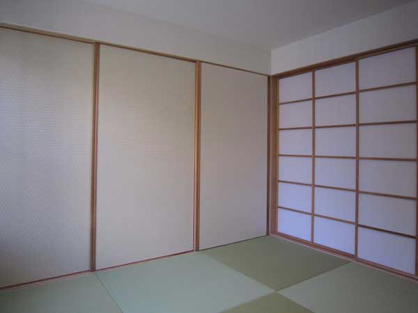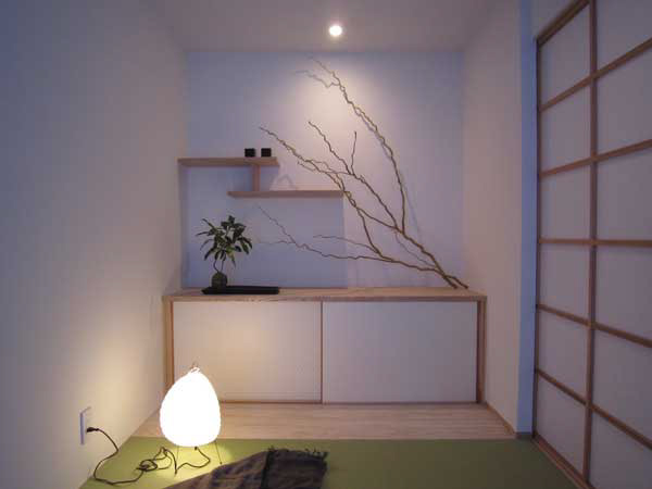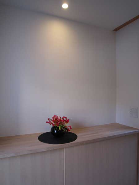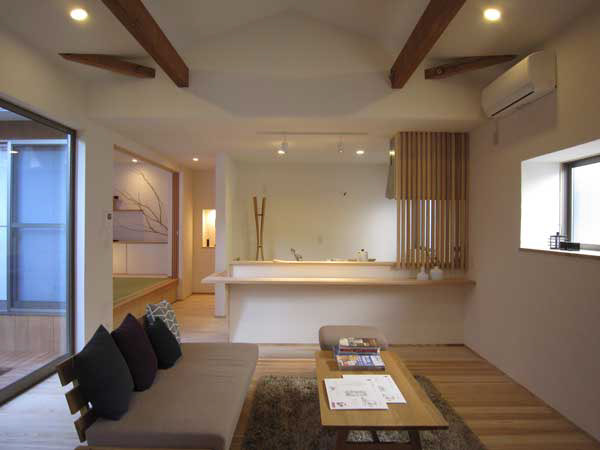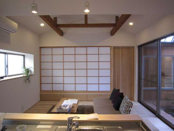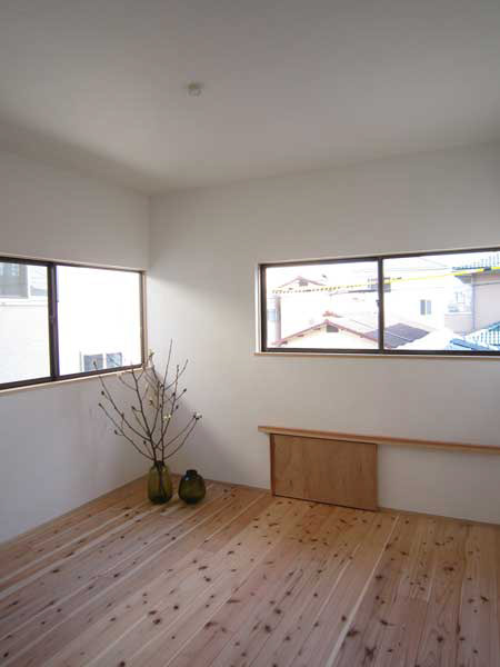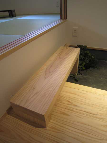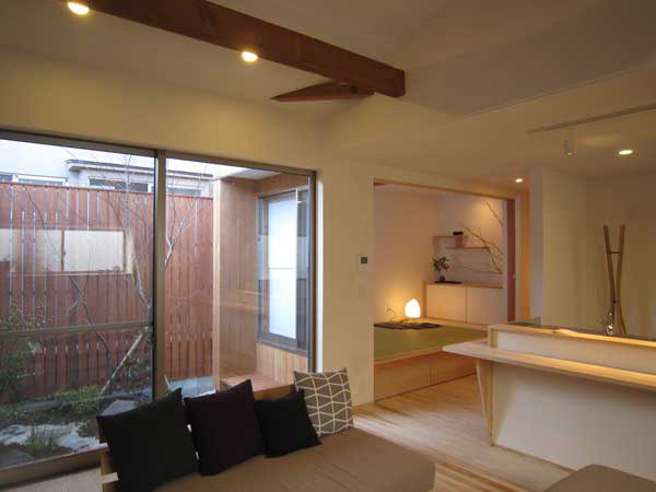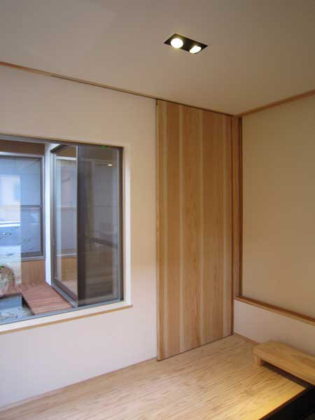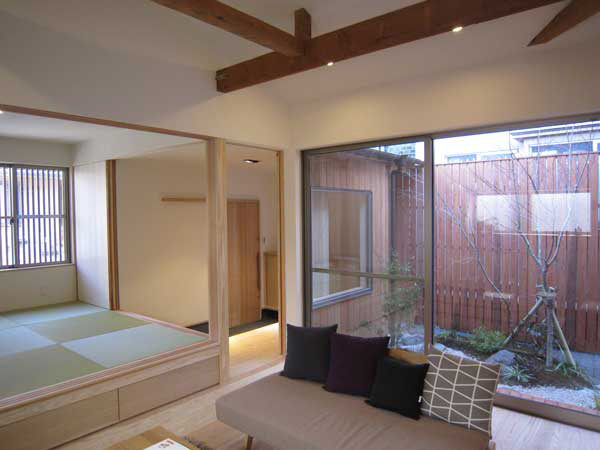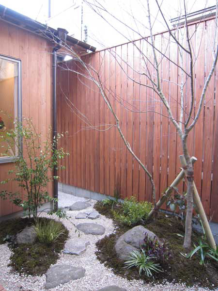 木造2階建、リノベーション、玄関の位置がもともと中央付近にあったためプライバシーが保ちにくいため、玄関位置を変更し、プライベートな庭を設けた。